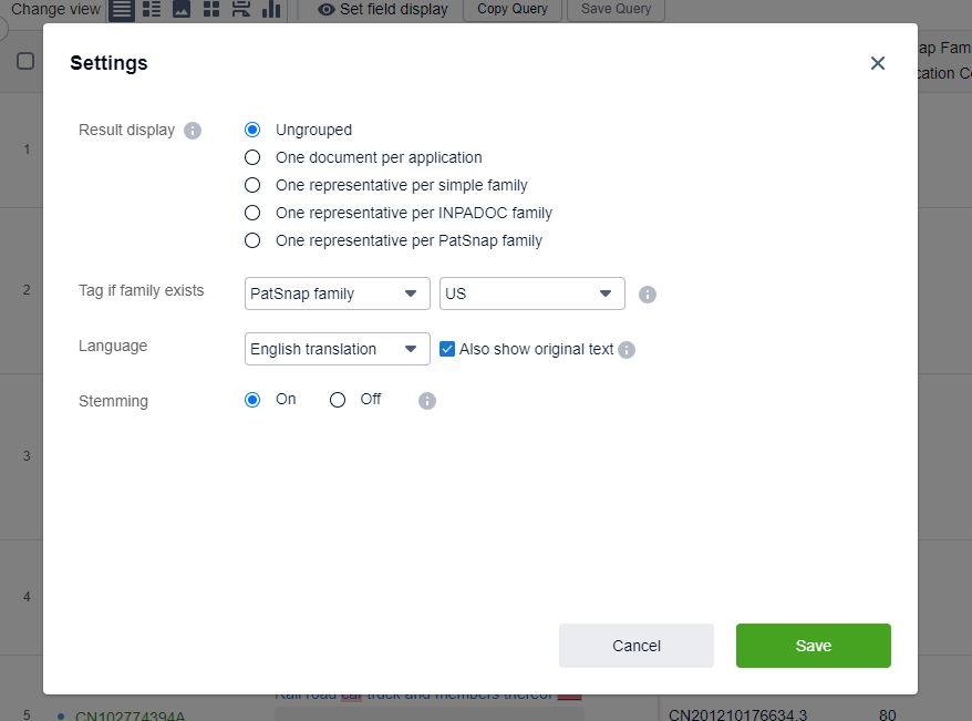 For search results, Patsnap includes any documents related to a certain patent from the original application, its revised versions, and the actual granted patent documents. With the "Result Display" menu, you can group/hide patents. Despite the utility as a refinement tool, it strongly affects the following analysis: