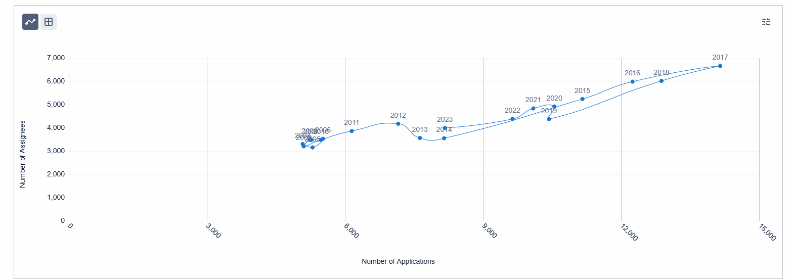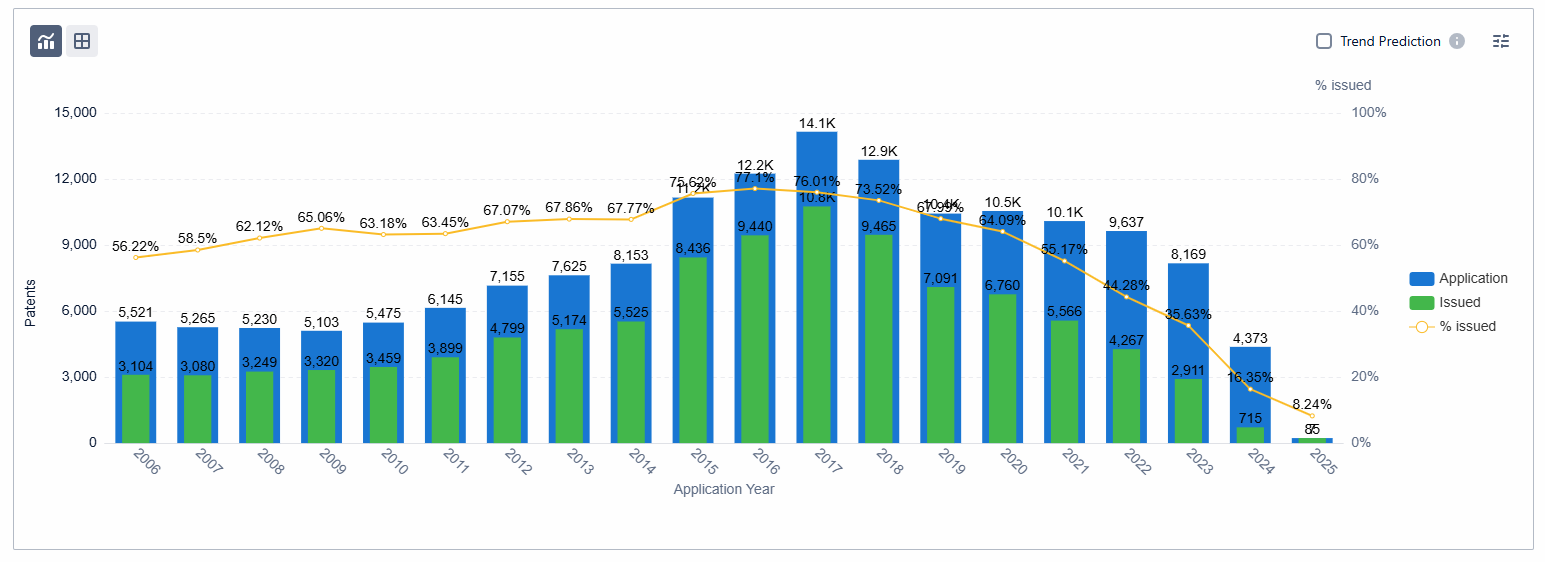 This chart illustrates the number of granted or issued patents resulting from applications filed in the same year. It provides valuable insights into the application rate over time, helping to determine whether the technology is emerging or nearing stagnation. The grant rate further highlights when technology protection is first established and shows the success rate of applications over a given period.