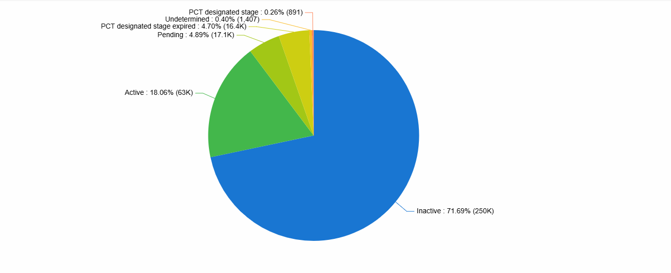 This chart shows a simple legal status breakdown of the technology field, indicating the proportion of patents that are active versus inactive. This insight can help you filter and focus on patents based on their current legal status.