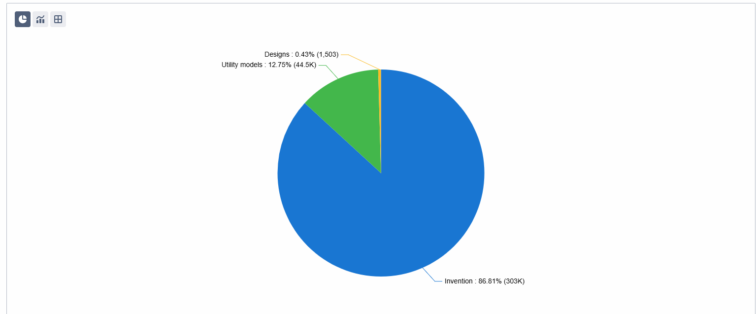 This chart shows the breakdown of patent types, offering insight into the strategic focus of organizations in this technology space—whether they are protecting functionality through inventions and utility models, or emphasizing appearance through design patents.