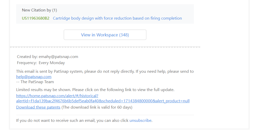 From here you can see the title/date range of your email alert as well as its type. "Workspace/Query" will tell you whether your email alert came from a search query or a workspace. It will also tell you the query for the former and give the name of the workspace and the folder where the email alert came for the latter.