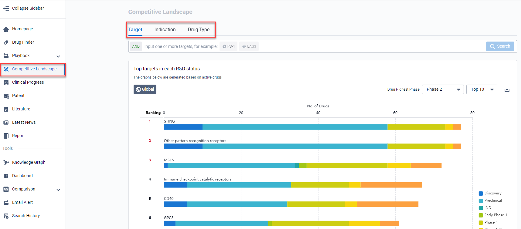 Additionally, you'll notice the presence of pre-populated interactive charts that you can utilize. For example, the chart in the image above showcases the top targets in each R&D status, focusing on phase two drugs and the top 10 targets. Now, let's zoom in on a specific drug type. Navigate to the "Drug Type" tab and search for "Monoclonal antibody" as an example. You'll notice that when you start typing, the system conveniently displays the desired drug type which you can simply click on. This is due to the Smart Search functionality. Clicking on "Monoclonal antibody" will open up a detailed page dedicated to the selected drug type, similar to the page you might have observed on the company detail page. On this page, we will find a wealth of information allowing you to assess the specific drug type and gain insights into its landscape.