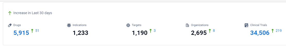 You will see at the top of the page that we have an overview table that provides general information on Monoclonal antibodies. For example, there are 5,915 drugs in total associated with monoclonal antibodies, with 51 drugs added in the last 30 days. Additionally, there are over 1,000 indications and targets associated with this drug type as well as over 34,000 clinical trials. The table is interactive in case you were looking to further assess the Clinical Trial or Drug information.