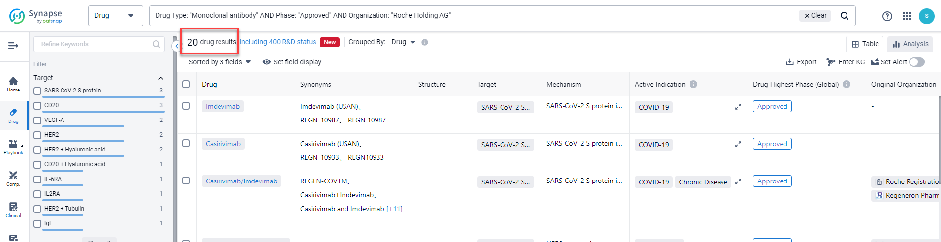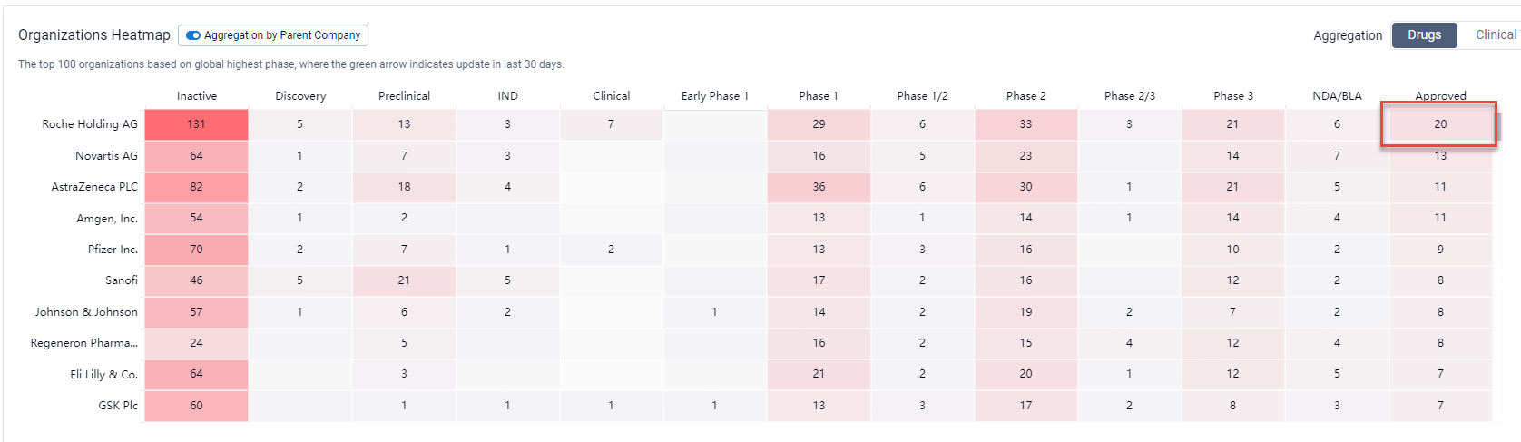 To emphasize the interactivity of Synapse, let's revisit the "Organizations Heatmap." Imagine you're interested in Roche, a major player in this drug type. By simply clicking on the number next to Roche's name, you can easily view the drugs approved for this specific drug type by company. By clicking on the number 20, it will take you to a search output showcasing those 20 drugs.