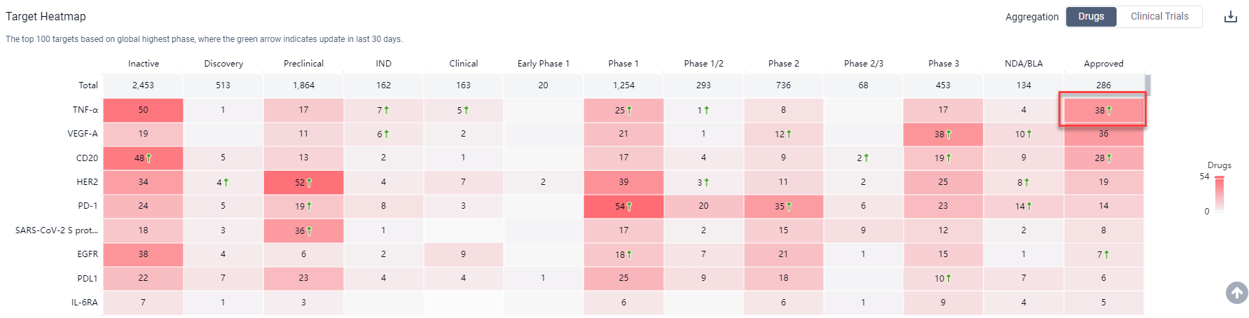 This functionality is applicable to other heat maps as well. For instance, if you are interested in drugs associated with the target TNF-alpha, you can click on the number 38 under the "Approved" column, which will provide a similar search output but with different drugs.
