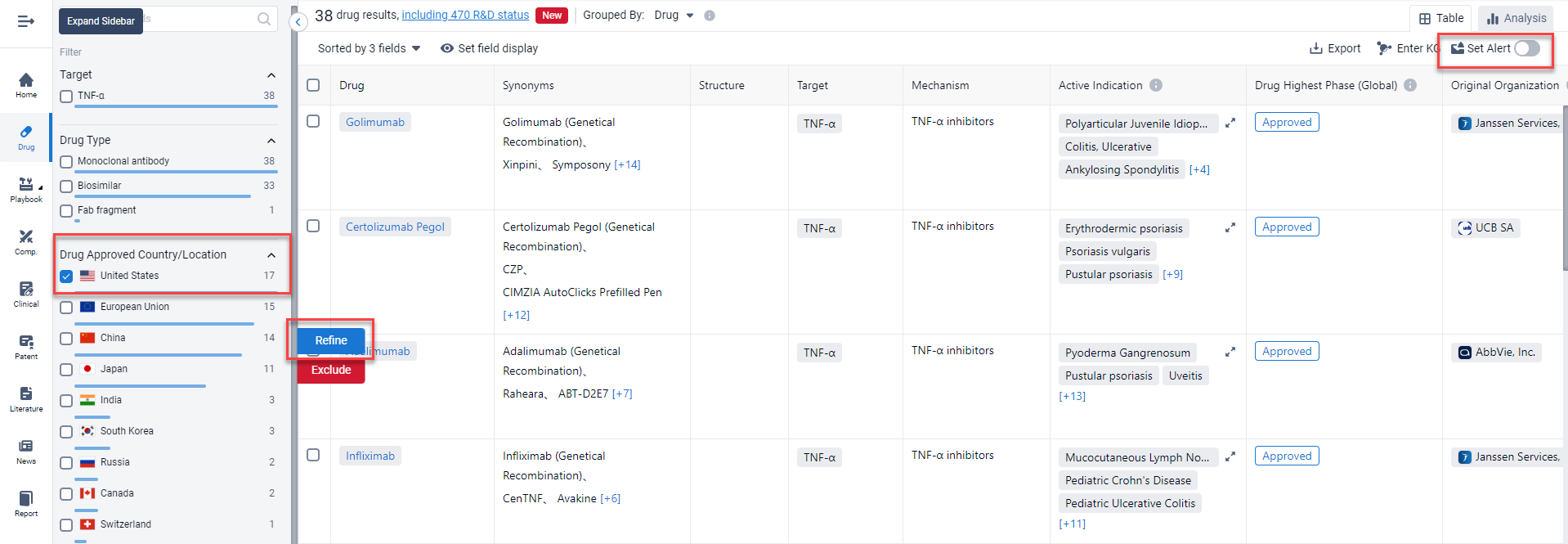 From there, you can further refine your search by adding criteria such as drugs approved only in the United States, allowing you to make granular searches. Additionally, you can also set up email alerts to notify you of any changes related to your specific search.