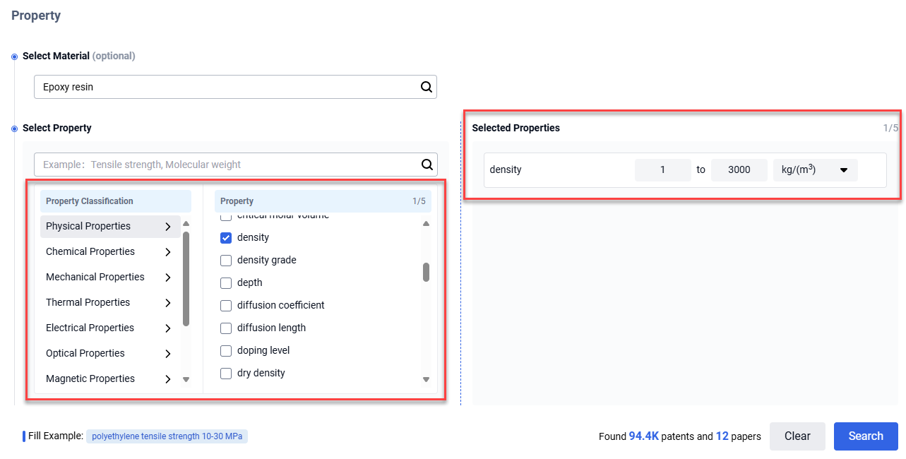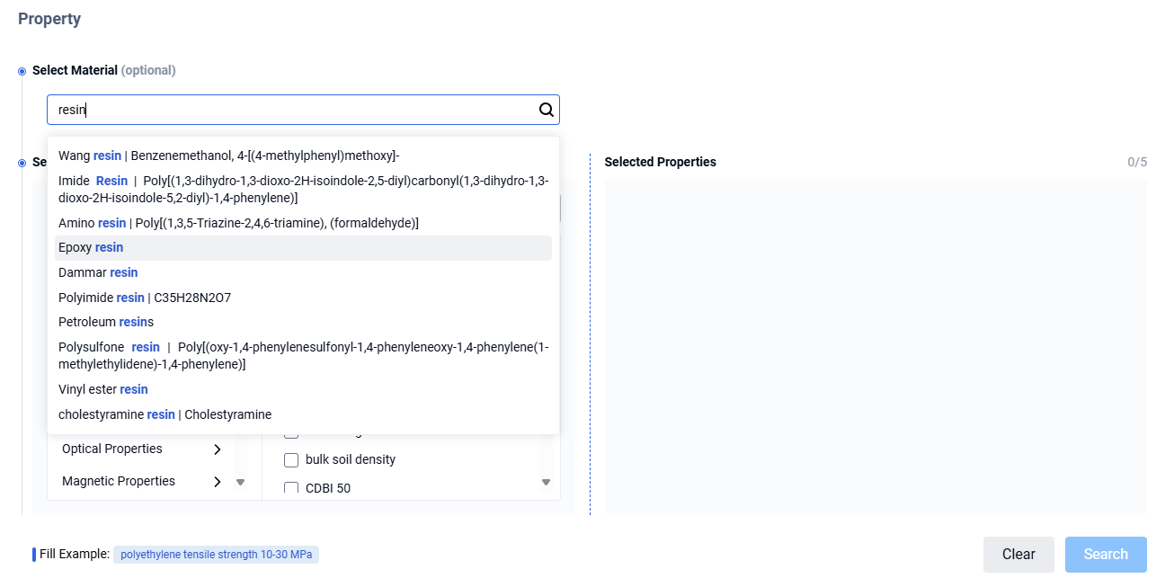 2. Specify Properties: Choose properties to characterize the desired performance. For example, you can search for properties such as tensile strength, thermal conductivity, or density.
