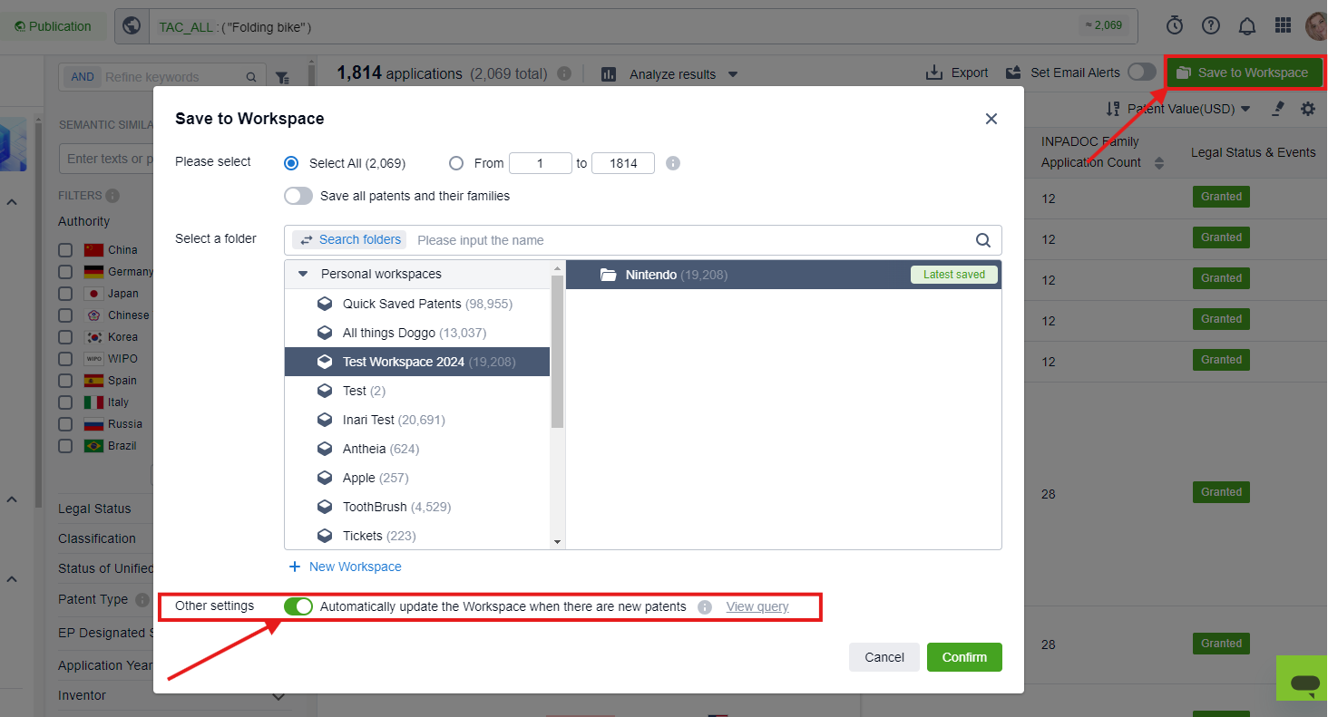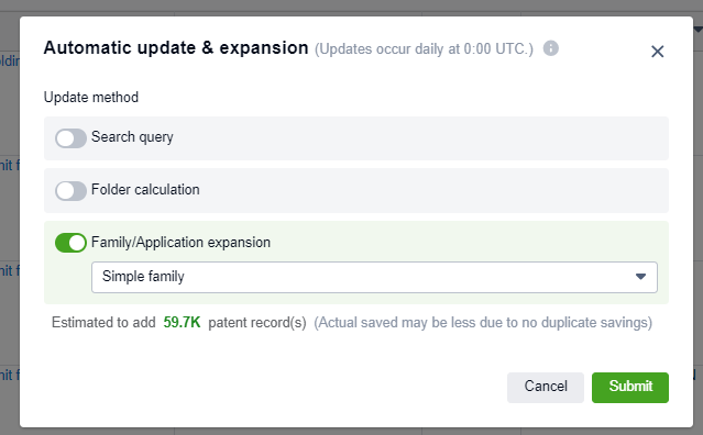 Finally, you can choose to automatically update your workspace via family expansion, which will add family members from existing patents in the workspace.