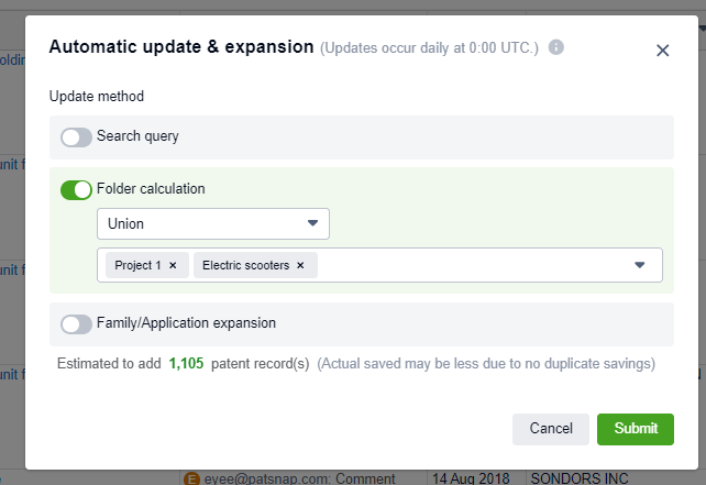 For example, in the screenshot above, when a patent is added to either the folder "project 1" or "electric scooters", those patents will be added to my workspace due to the union calculation method.