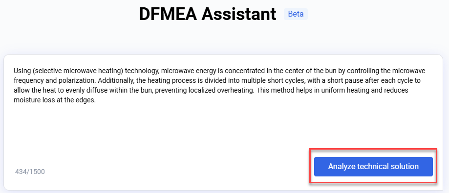 Step 2: Enter a brief yet comprehensive description of your technical solution, such as “Using (selective microwave heating) technology, microwave energy is concentrated in the center of the bun by controlling the microwave frequency and polarization. Additionally, the heating process is divided into multiple short cycles, with a short pause after each cycle to allow the heat to evenly diffuse within the bun, preventing localized overheating. This method helps in uniform heating and reduces moisture loss at the edges.”