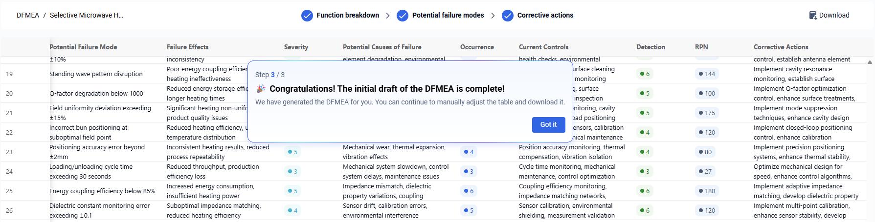 - Automated DFMEA Generation: Effortlessly produce detailed DFMEA reports without manual intervention.