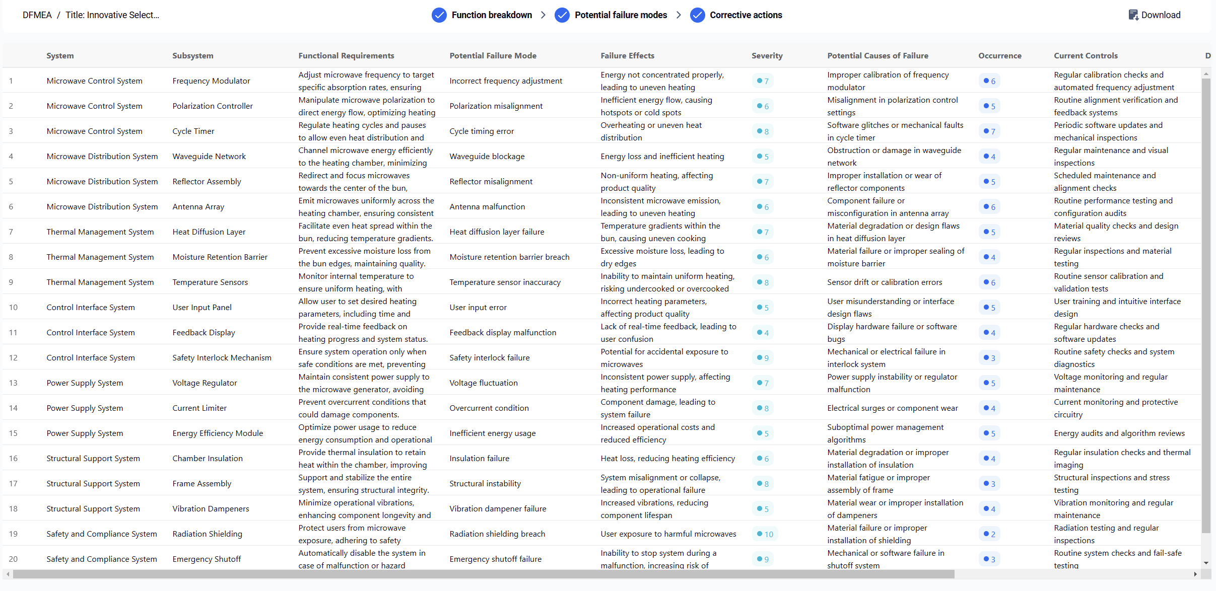 3. During the analysis process, you can adjust the content in the three analysis phases: "Function Breakdown," "Potential failure modes," and "Corrective Actions." Once you have reviewed and confirmed the adjustments, click "Generate" to obtain the DFMEA analysis report.