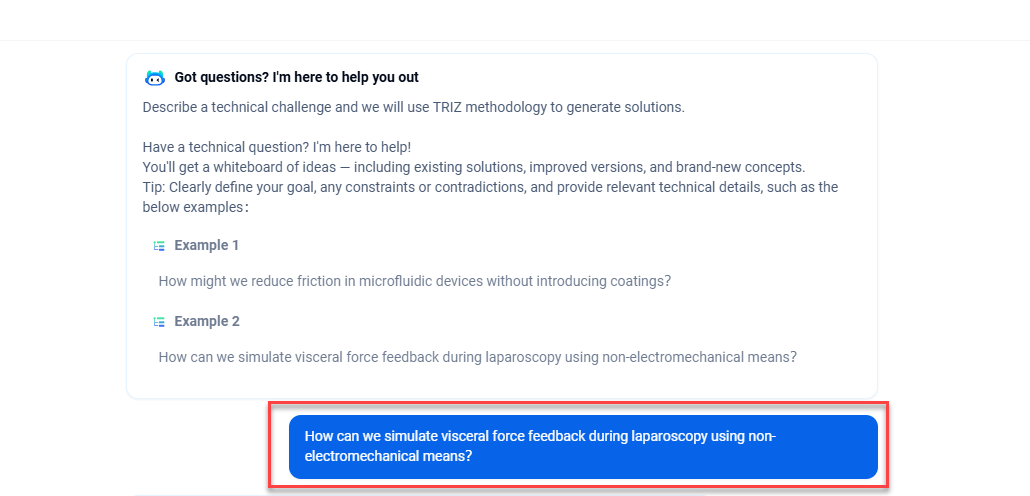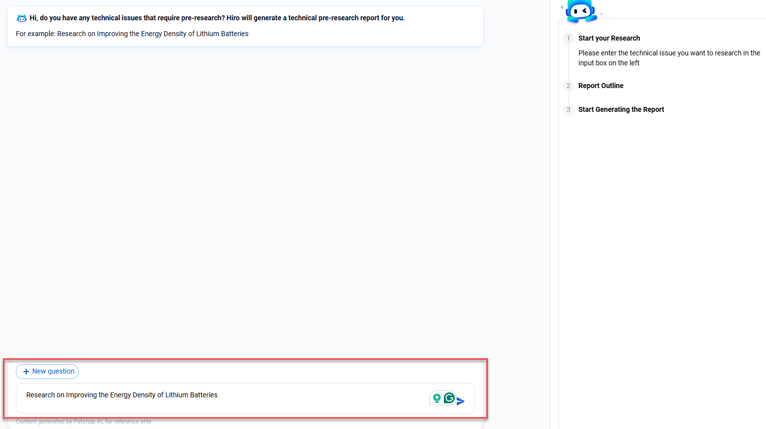 2. Enter your technical question. To obtain more precise and reliable technical solutions, it is recommended that your technical question include the "technical problem, target objectives, and constraints."
