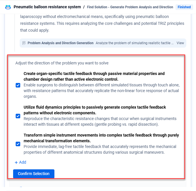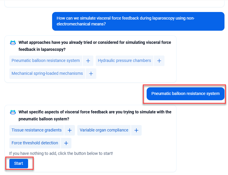 3. Through multiple rounds of dialogue, clarify the technical problem you aim to solve. Then click on "Start" to analyze the product direction.