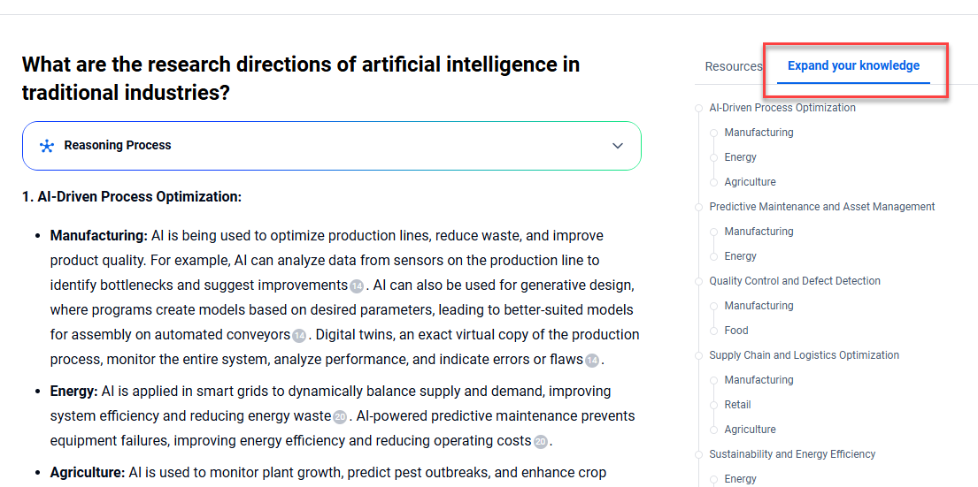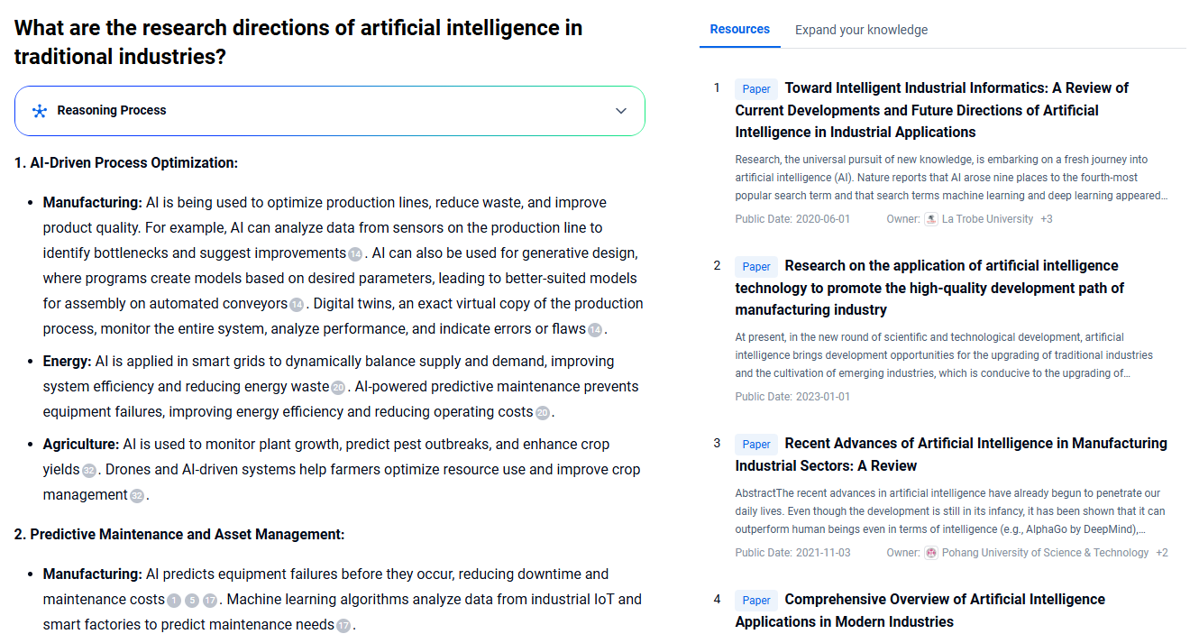- Each response is supported by authoritative data sources such as patents and academic papers.