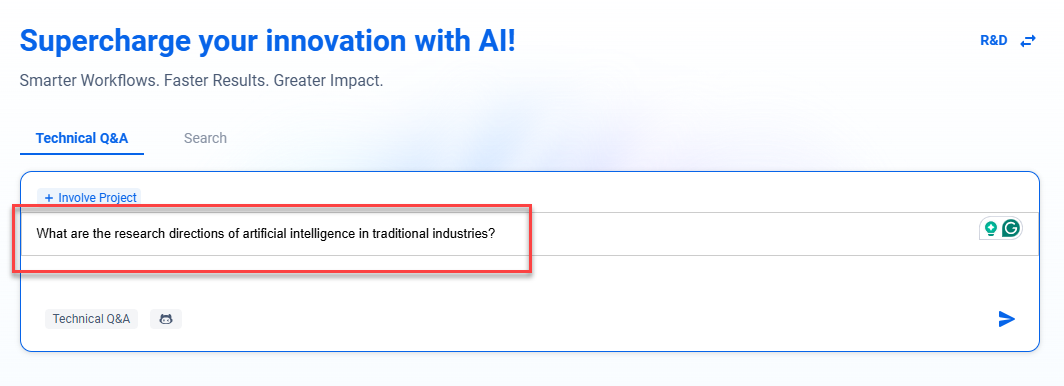 Step 2: Enter your technical question or search term, such as “What are the research directions of artificial intelligence in traditional industries?” or “What are the technical challenges in the miniaturization of electronic devices?”. For more precise and reliable technical answers, it is advisable to provide specific keywords or clearly defined questions.