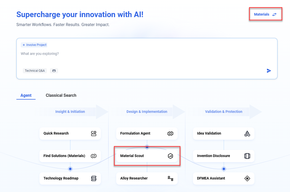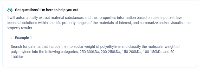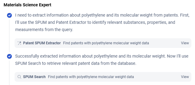 The Material Scout AI Agent extracts materials and substances from patents and literature and links them to their properties. It will define an appropriate search, retrieval and analysis strategy based on your input, saving hours of manual research and ensuring high quality insights.