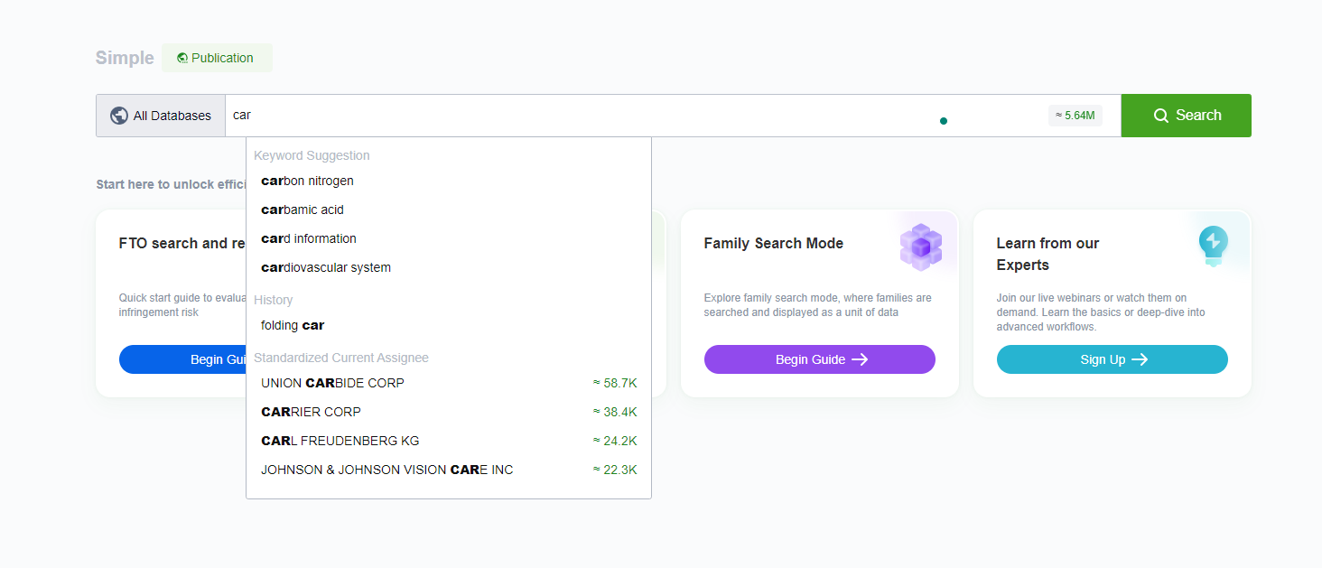 Additionally, in the case of English keywords when you start typing in the search box smart search will suggest words based on the most common words that start with the letters that have been inputted. (based on the number of patents these terms appear in)