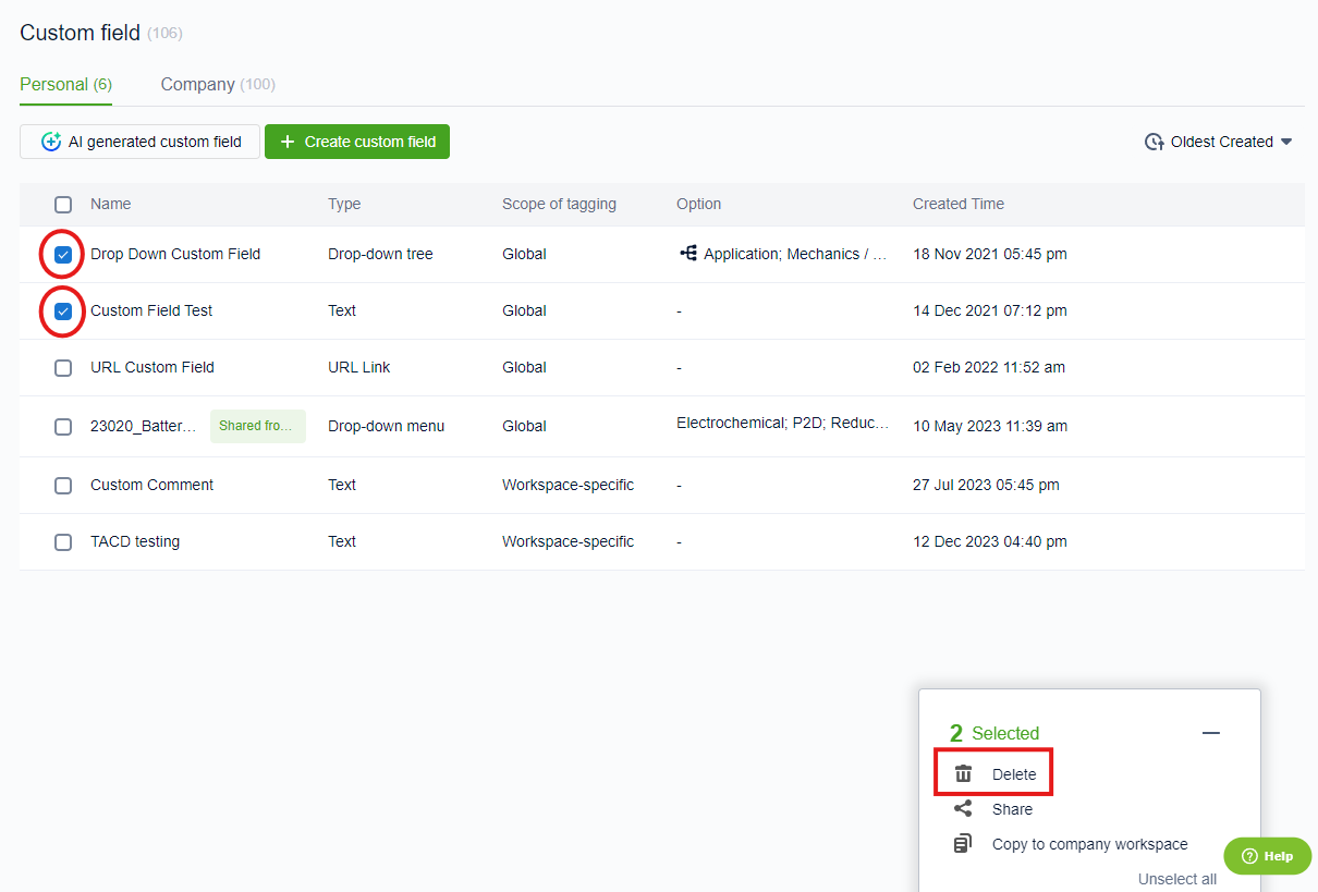 The third and final level for deleting custom fields is by deleting them from the entire Workspace area.