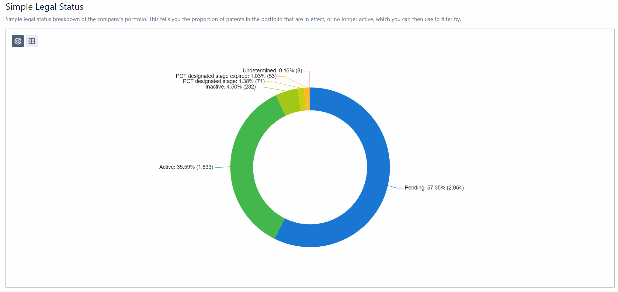 If you have seen the "Portfolio Overview" chart in the "Innovation Profile", you may have noticed that "Undetermined" appears as well as the expected statuses (active, inactive and pending). The reason for this is because we have not yet been able to obtain the expected simple legal statuses for these patents from their corresponding patent offices. To combat this, we currently have a substantial focus towards reading through the legal data for these patents to obtain the simple legal statuses for them.