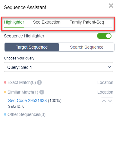 There are three main features of the Sequence Assistant: Highlighter, Seq Extraction, and Family Patent-Seq: