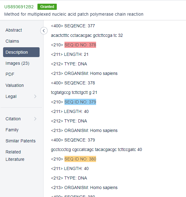 There are times when you might go into a patent and find that it does not have any sequences. There is, however, one or more family members that possess these sequences. Therefore, this feature allows you to quickly check the sequence of patents of the same family and will also let you know how many sequences there are in those patents. By clicking on the publication number, you will be able to jump from a patent with zero sequences to a patent with sequences.