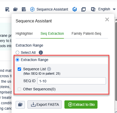 Using Seq Extraction, you can export all of the sequences within an individual patent as a FASTA file or extract them into Bio. On the results page, you can also extract sequences from multiple patents. Just select the patents of interest and choose to extract sequences from the pop-up window on the bottom right.