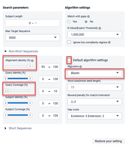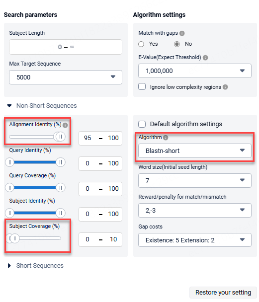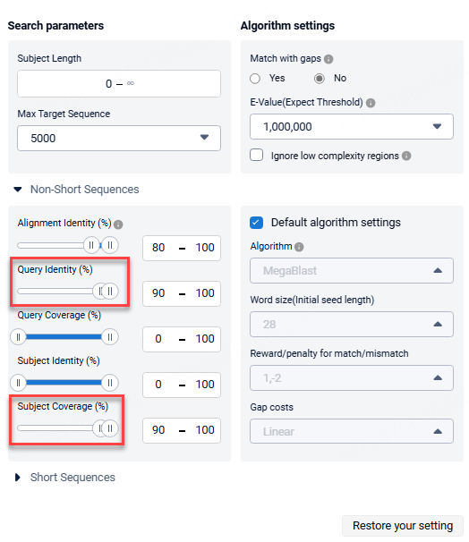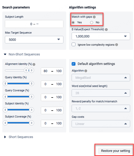 When using short sequences to retrieve long sequences, for example, if you know the sequence of a linked peptide (GGGGSGGGGSGGGGSGGGGS) and want to find the long sequence containing the short peptide. In this case, you can use an Alignment Identity of 95-100 and Subject Coverage of 0-10. Along with this, you can use the Blastn-short algorithm: