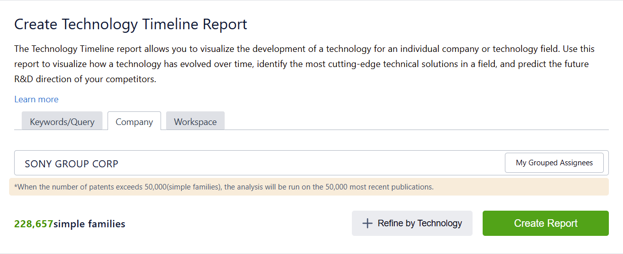 To create a Technology timeline based on a certain company, select the "Company" tab, and enter a company name. You will be presented with suggestions matching your search, click on one of the available suggestions, and then on "Create Report".
