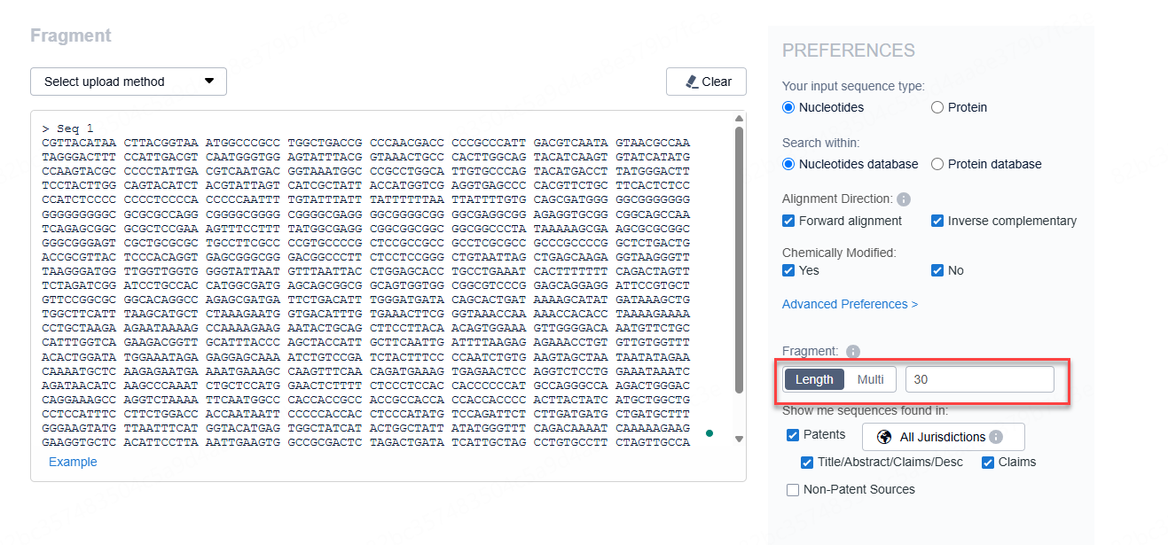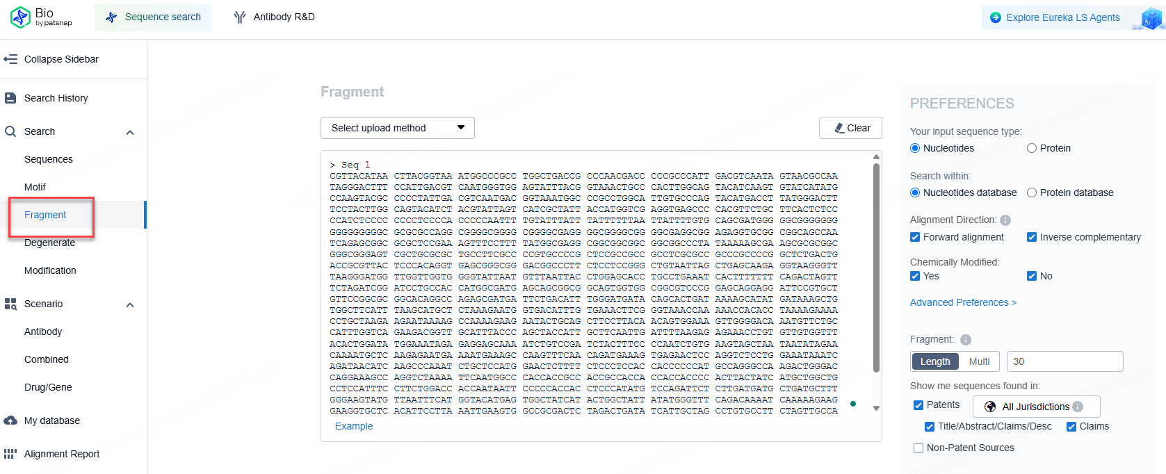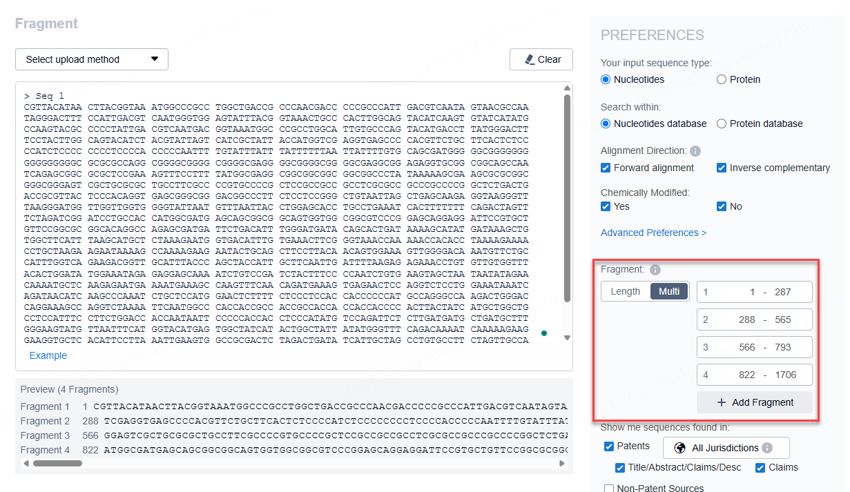 The fragment search function searches for sections of DNA, RNA, or protein sequences. The tool allows for fragments to be searched by size and position.