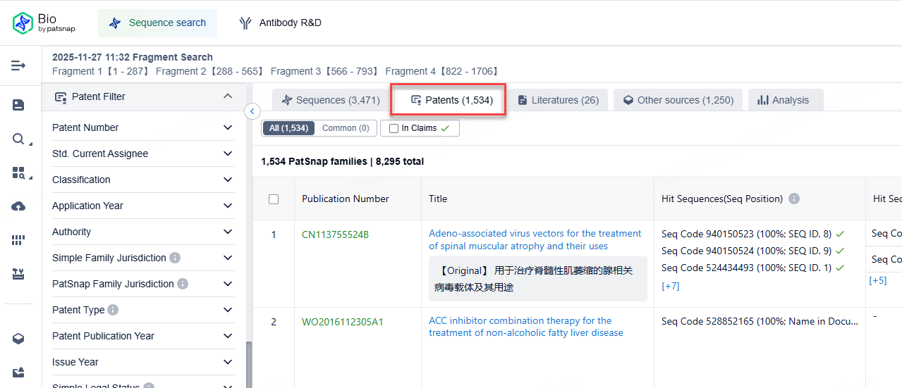 On the search results page, you have the option to filter your results using the filters on the left. Once you are happy with your filters, you can click on the "Patents" tab to view patent results: