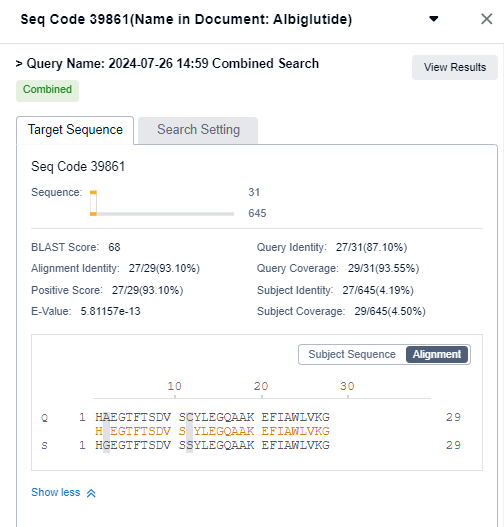 Tip: The workspaces are now enabled to show sequence data from the bio platform when you click the Seq Code. Clicking View results from this pop-out box will redirect you to the Bio platform. To further analyze the patent, click on the patent name or title.