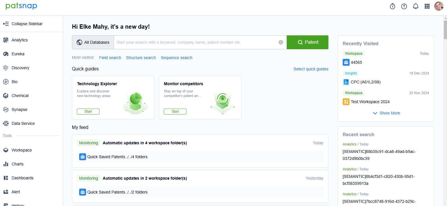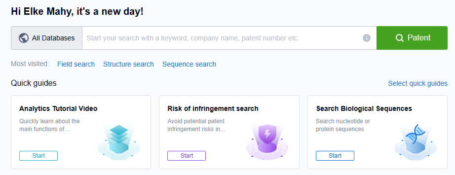 2. At the top of the center of the page, you will see the search bar (this will be a patent search unless you don't have access to Analytics), links to the most visited search types and at least 3 quick guides which enable you to quickly perform common workflows in Patsnap. You can remove and add any of the quick guides you may find useful by selecting the "Select quick guides" option.