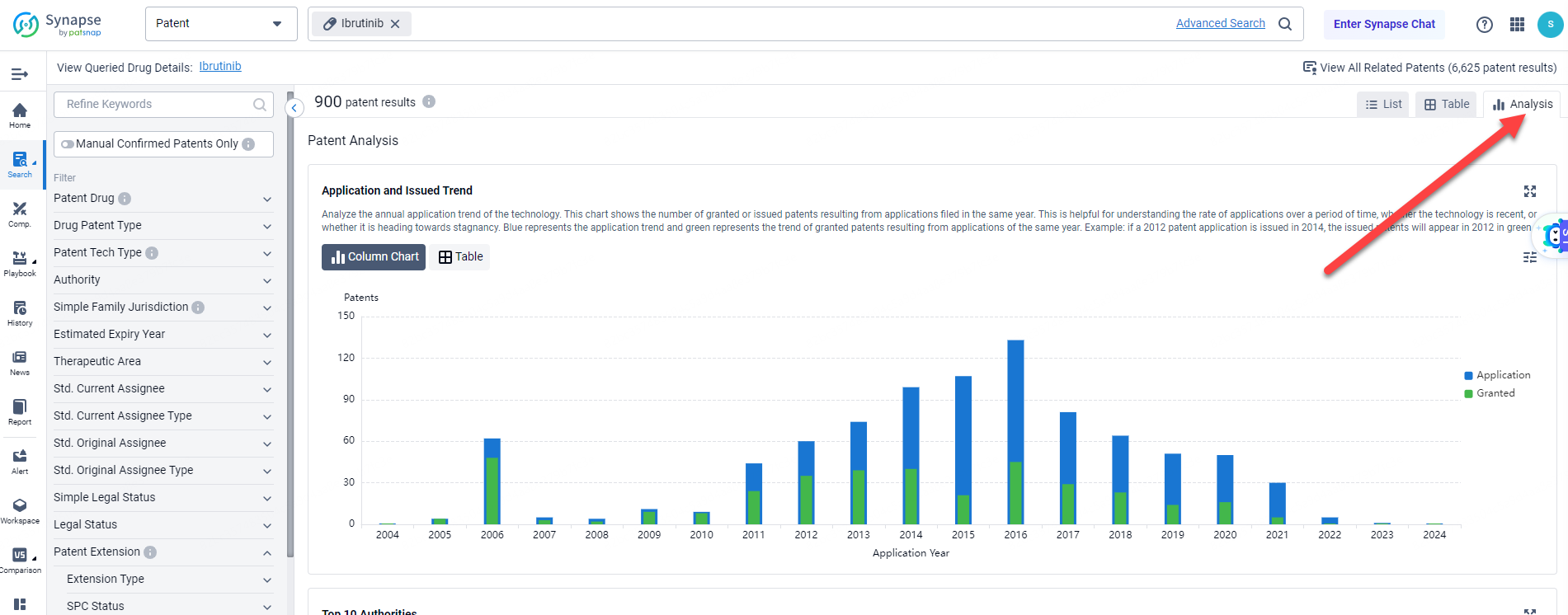 In order to support strategic business decisions, understand the competitive environment, or compare possible new technology areas to explore, patent data is extremely valuable. With the new 'Analysis' tab for patents, you can easily analyze thousands of data points simultaneously, such as application trends, assignee relationships, top authorities, therapeutic areas, etc. Compared to manually creating charts in Excel, this will save you a lot of time and help you get key data much faster.