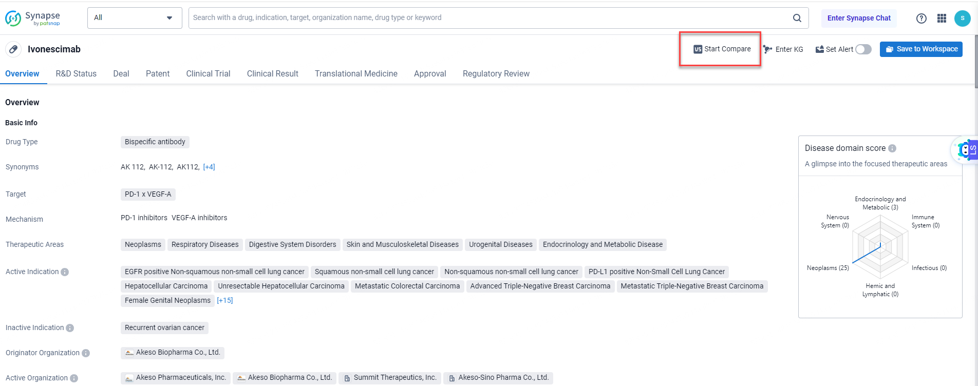 Many dimensions need to be used for comparison, including but not limited to basic information, research and development progress, associated clinical data, etc., and there are differences in dimensions when comparing different entities. The Entity Compare feature in Synapse allows you to compare up to 4 entities (drugs/targets/organizations/indications) to help you quickly understand the similarities and differences between entities and perform in-depth reviews. Furthermore, this feature allows for faster workflow as you do not have to move back and forth between different pages to perform your comparisons since you can compare on the same page.