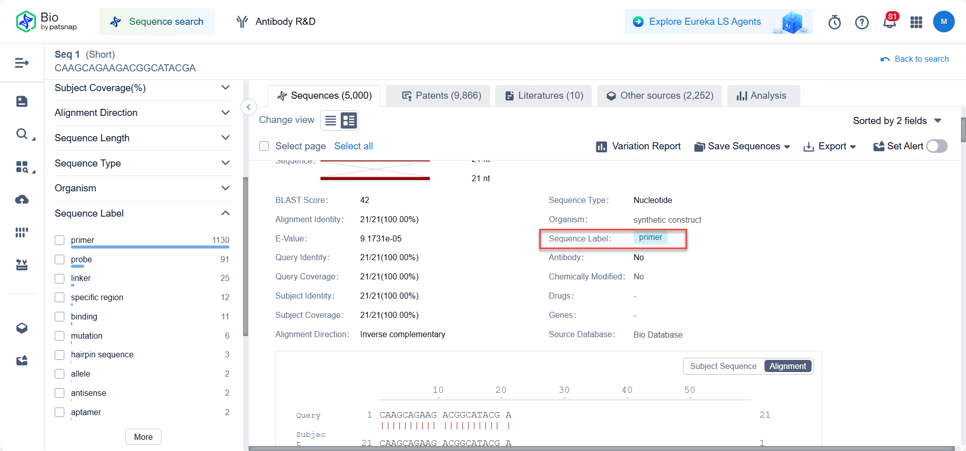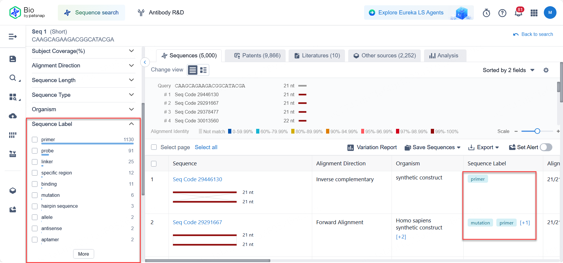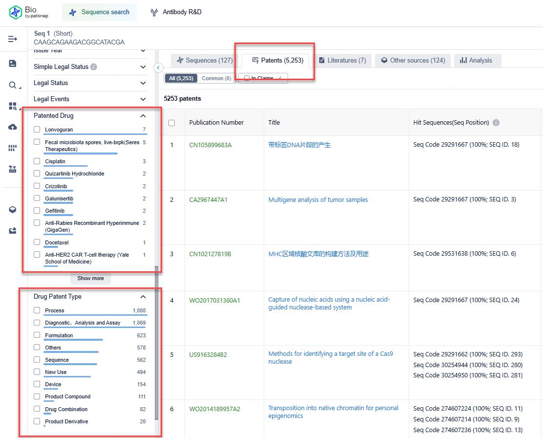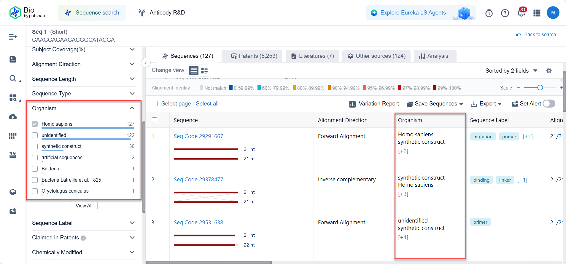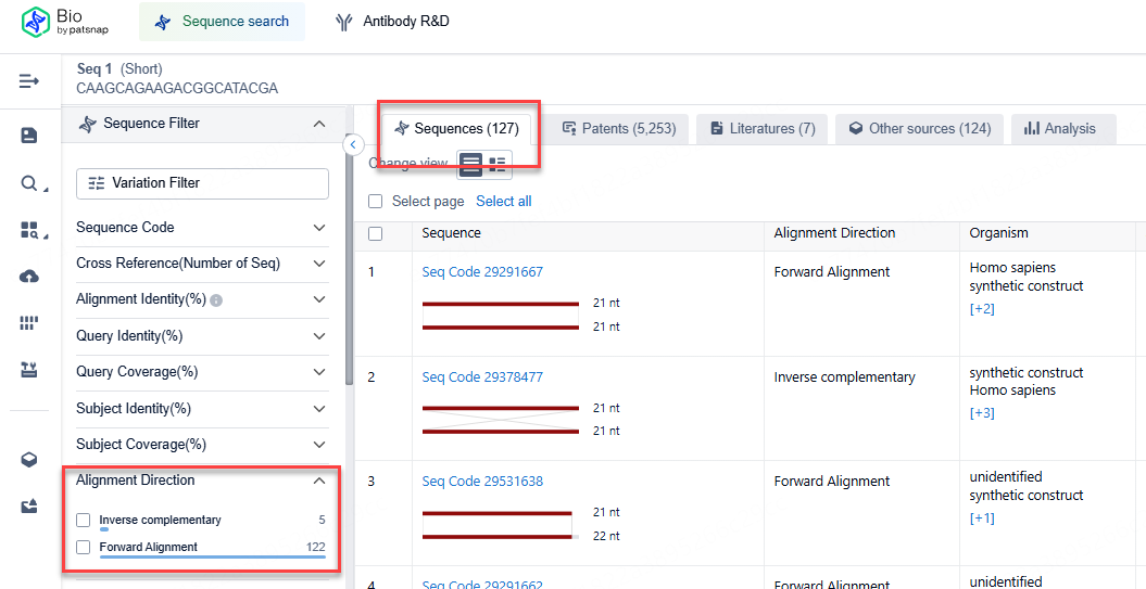 When conducting nucleic acid searches, the BLAST algorithm will automatically return the sequence of forward matching and reverse complementary pairing. However, it is difficult to filter these sequences and requires significant manual effort. Therefore, an ‘Alignment Direction’ filter has been added to the Sequence Results page to allow users to refine by "Forward Alignment" and "Reverse Complement". The filter can be used to focus on the sequences of importance to the user, for example, if there is an invention that does not involve antisense technology, then these strands may not be of interest to them.
