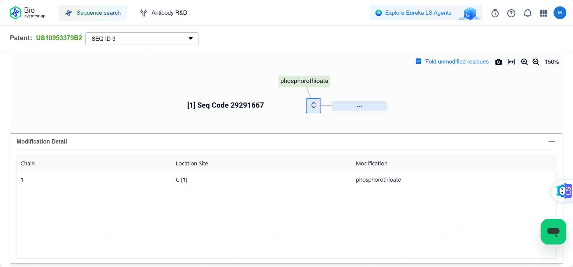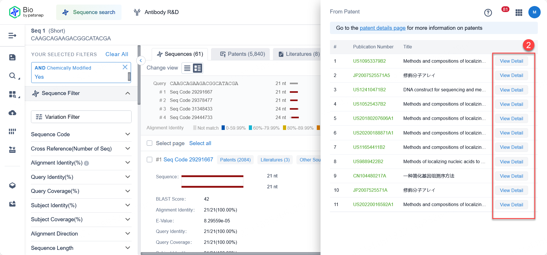 Chemical modification of biological sequences is important in many fields such as polypeptide drugs, gene therapy, viral vectors, etc. Both researchers and IP personnel pay attention to the specific modification of the sequence described in the text, including modification position, and chemical group type. At the same time, in a patent, there will be different modification methods for the same sequence corresponding to different experimental results, which need to be clearly distinguished. At present, online chemical modification cannot directly display the position and type of chemical modification, and there is no distinction between different modification schemes of the same patent. You must currently go to the Sequence Detail page to view details of the modification and it is difficult to easily digest this information. Therefore, Where Chemically Modified is selected as 'Yes', a ”View Detail” link has been added to the Sequence Results and Detail pages to quickly view modification information. This will open a pop-up tab on the right, from which you can see more details and view modification information graphically.