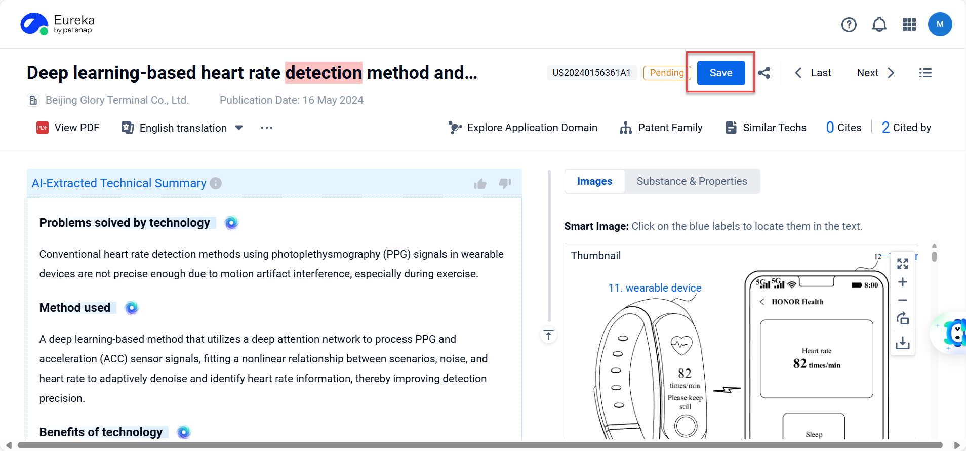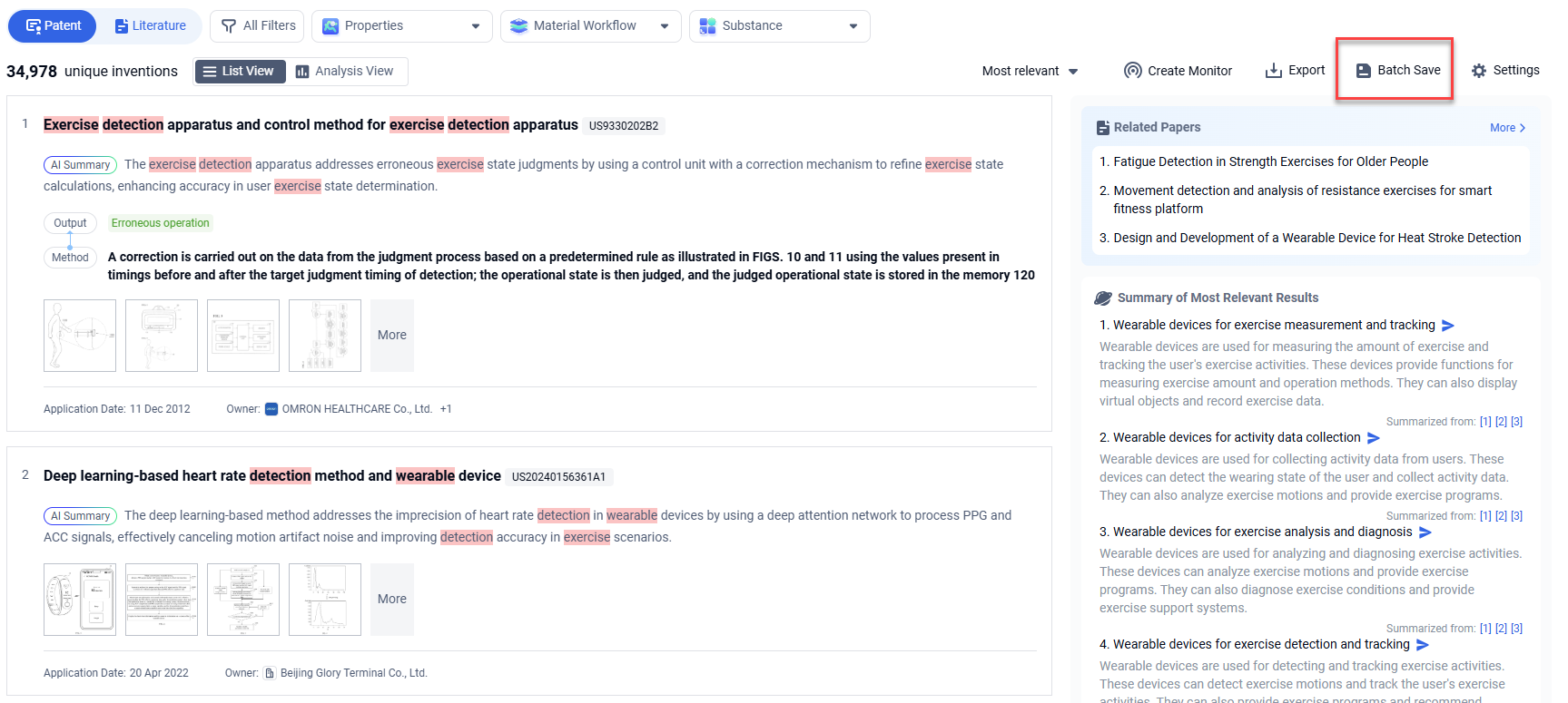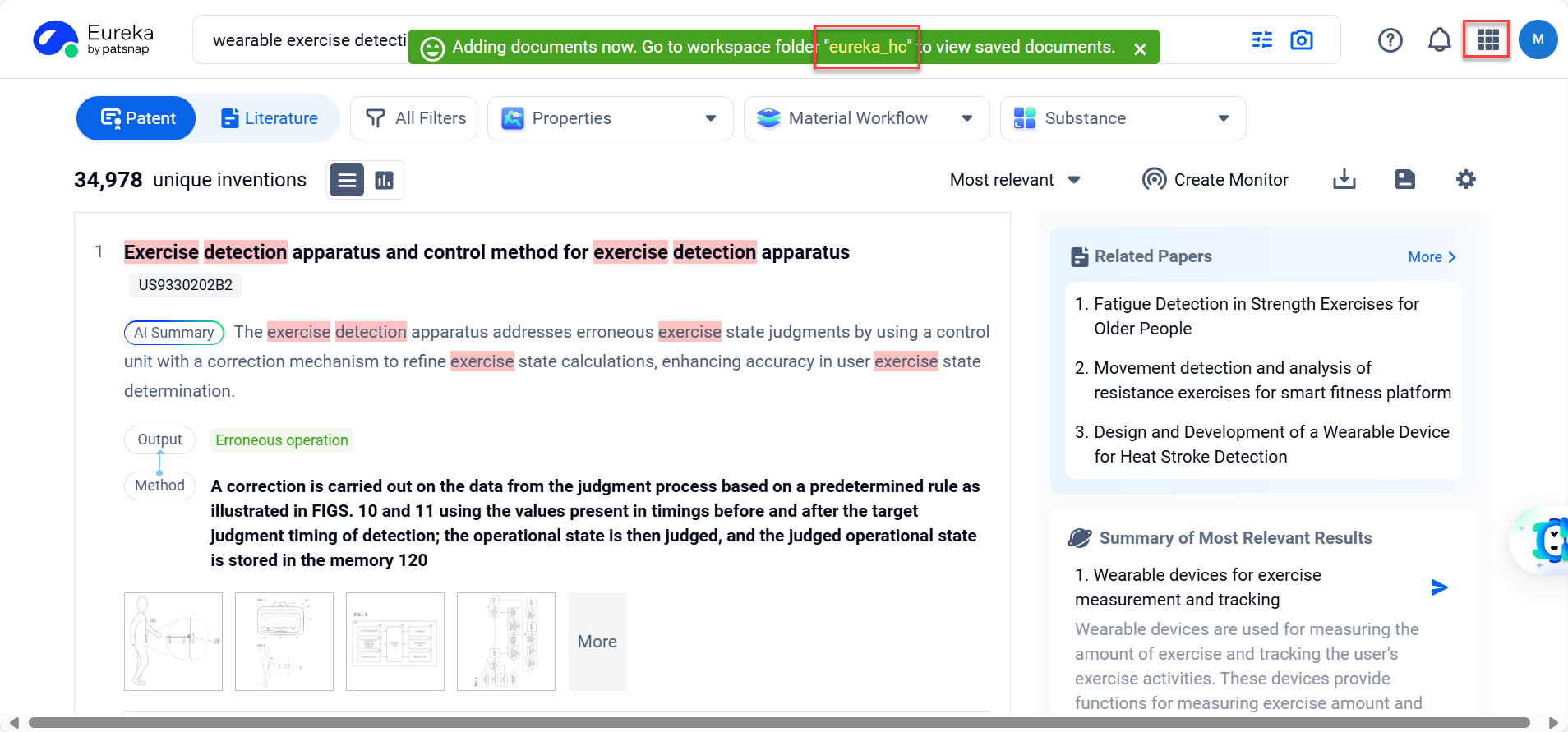 There are 2 ways to save patents in Eureka to a Workspace. You can either save them from the search results page using "Batch Save," or you can save patents directly from patent view.