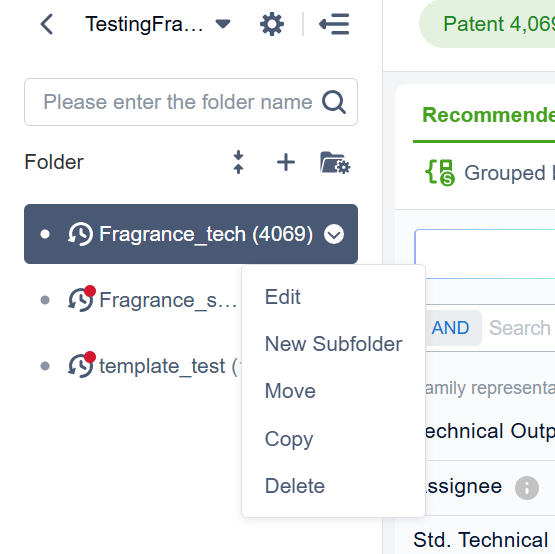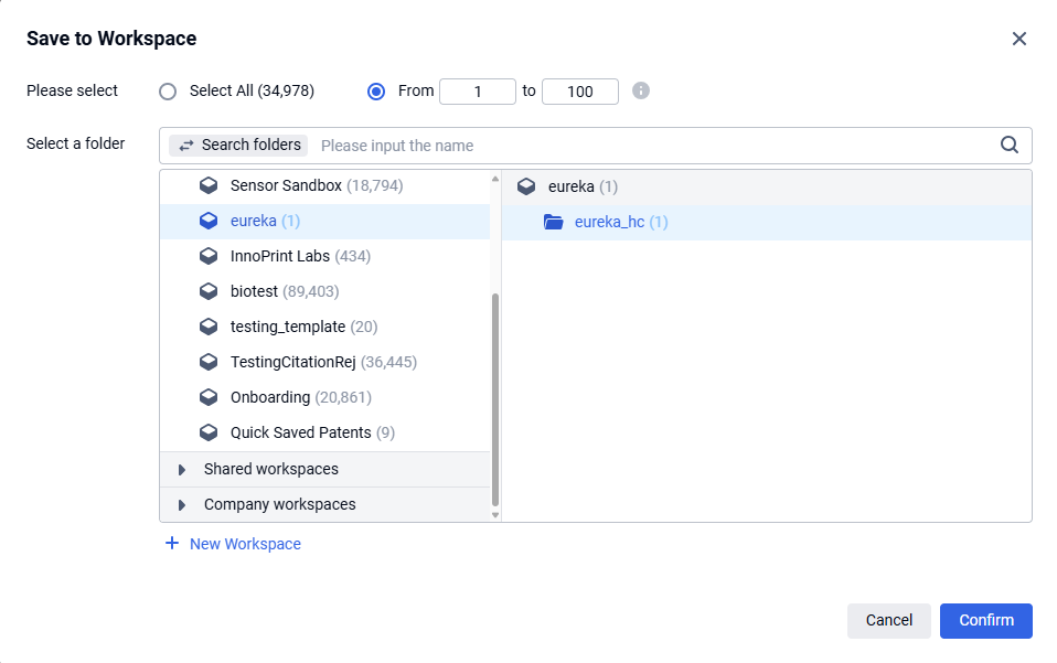 When you click on "Save" or "Batch Save", this will allow you to decide which Workspace and folder the patent(s) should be saved to, with the option to create a new folder for saving as well.