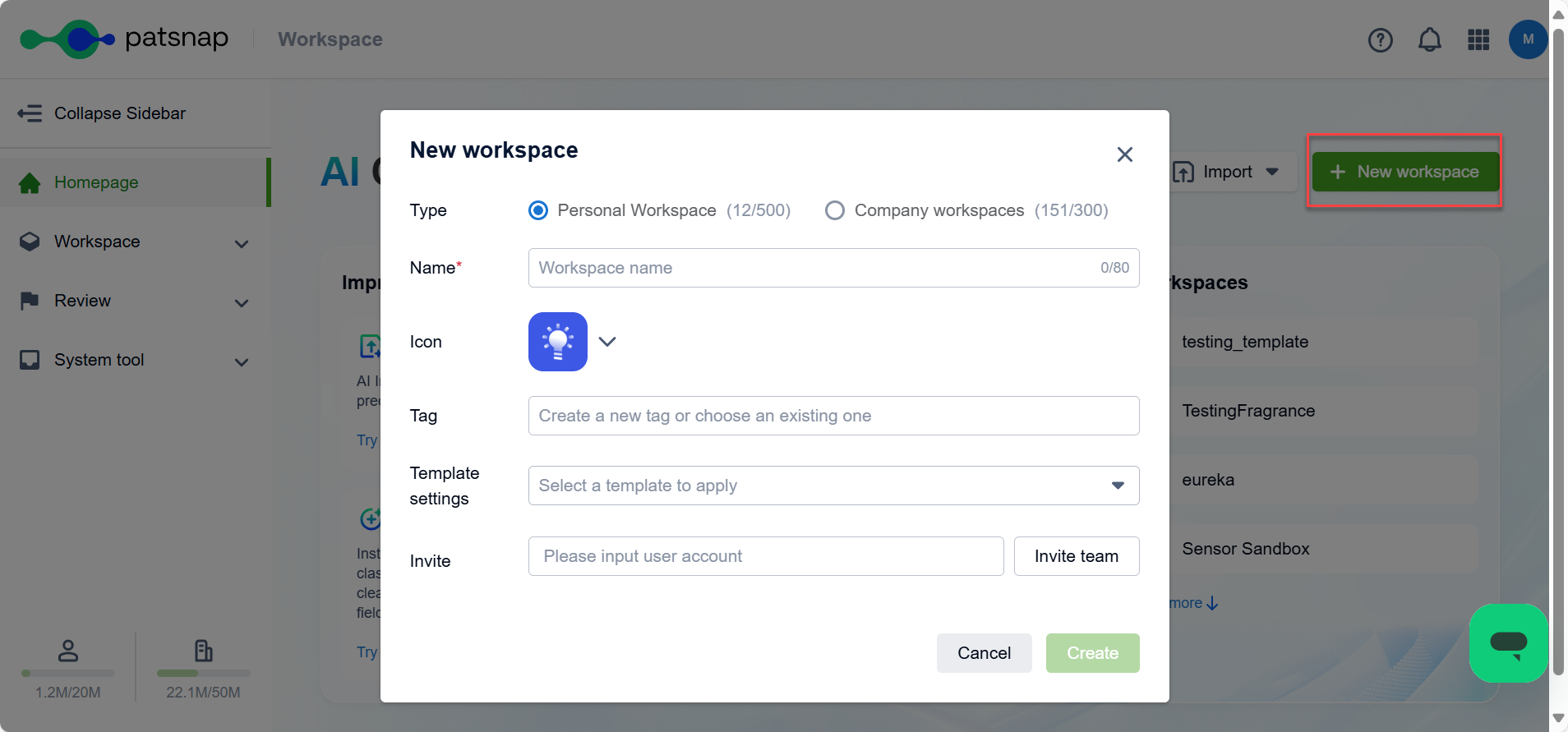 You have the option to click on "New Workspace" which allows you to create a Workspace and give it a name along with an associated icon. You can also tag your workspaces for easy filtering and apply any templates with regard to the results view. You are also able to invite collaborators.