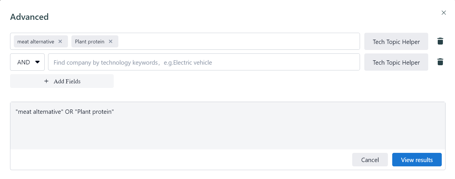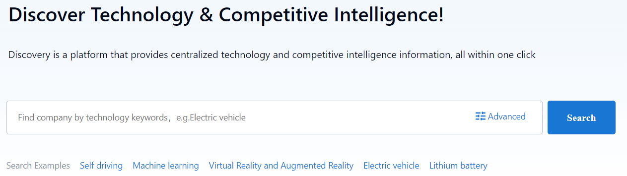 A Technology and Competitive Intelligence search can be started by entering technologies or keywords of interest into the search bar while on the home page of Discovery, through either Simple search mode or Advanced search mode. When using a combination of words, such as "Electric vehicle", the search will prioritize the combination of these words in your final results but may also include results with either or word combination.