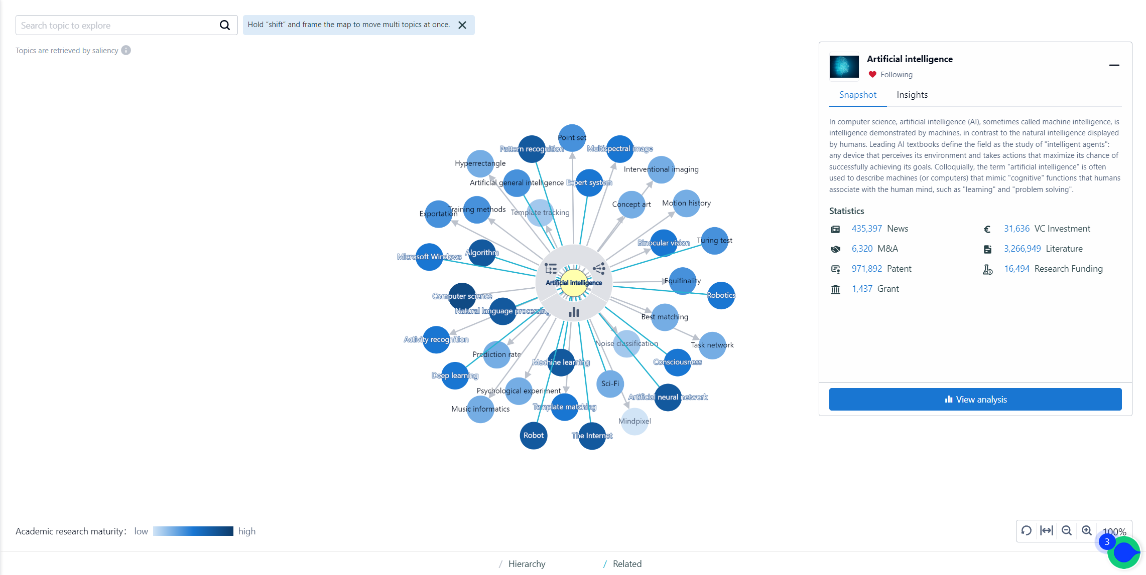 The darker shade of blue the circle, the more mature the academic research around it is.