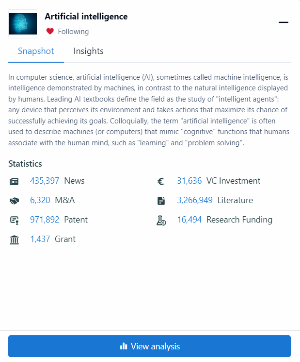 - Patents: This will show the latest, highest value and most cited patents related to this field.