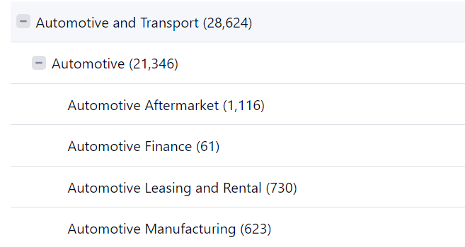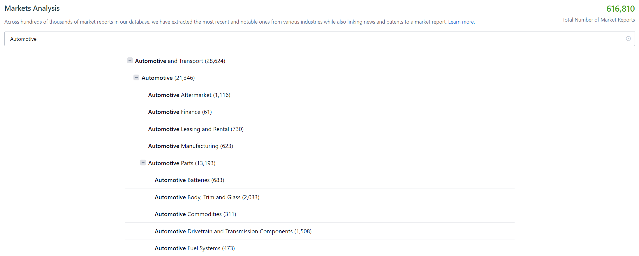 If you can't see a specific market sector that you are interested in, then you can search for it using the search bar. For example, if you are searching for "Automotive", you will get the following results which match your search term.