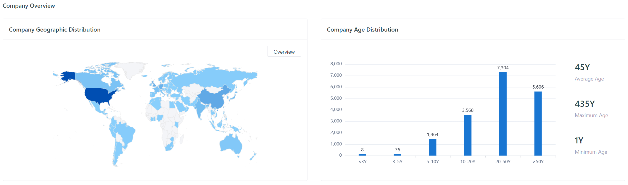 From here, you will be able to see a distribution of both the location and age of the different companies involved in this sector within the Company Overview.