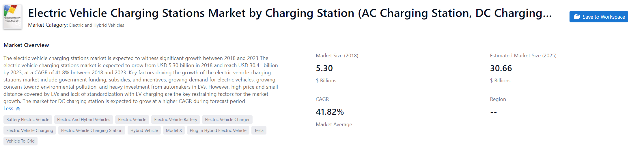 At the top of the page, you will be able to save the report to a Workspace, along with seeing the sector that this report is in, market overview, associated topics, total current market size, estimated market size, CAGR and the region that this report concerns.