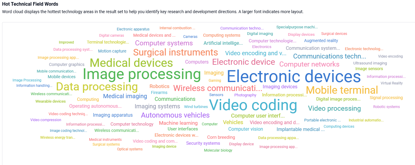 This produces a word cloud with the top technical field words we have extracted from the patents in your result list.