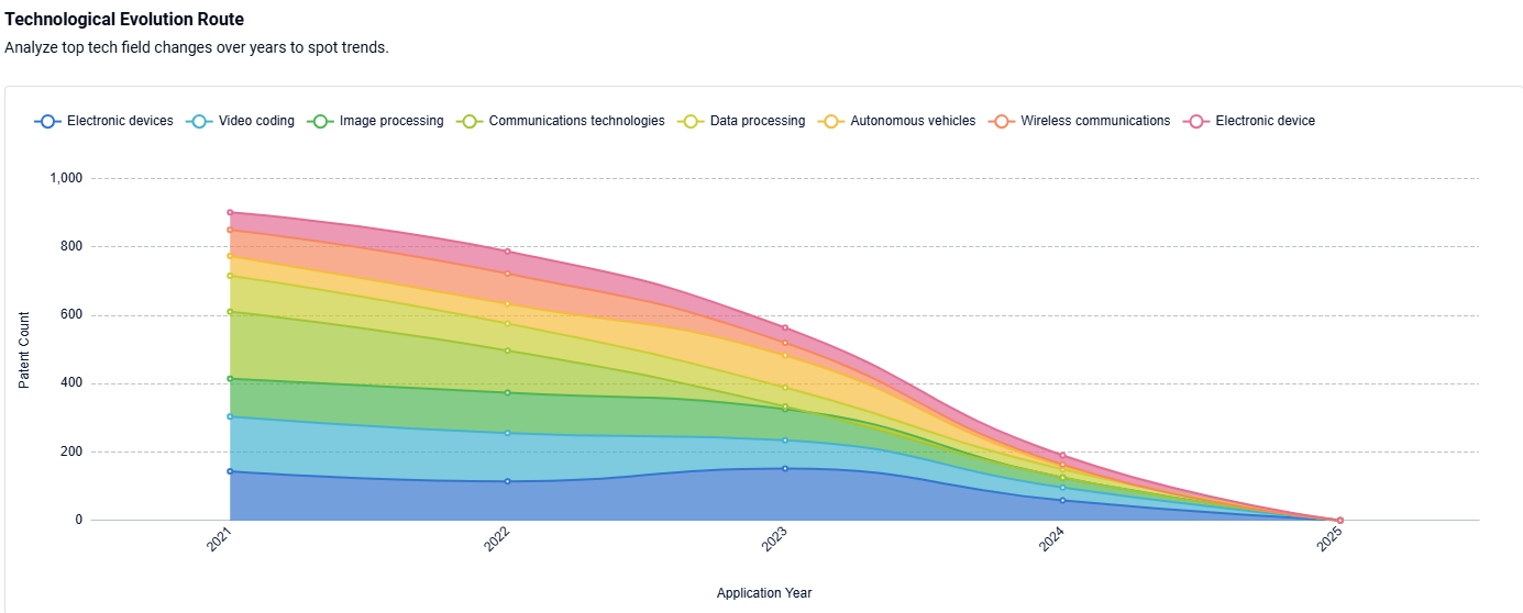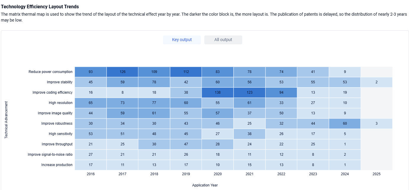 This thermal map shows the trend of the most common technical effects/efficacy phrases covered by your results over time.
