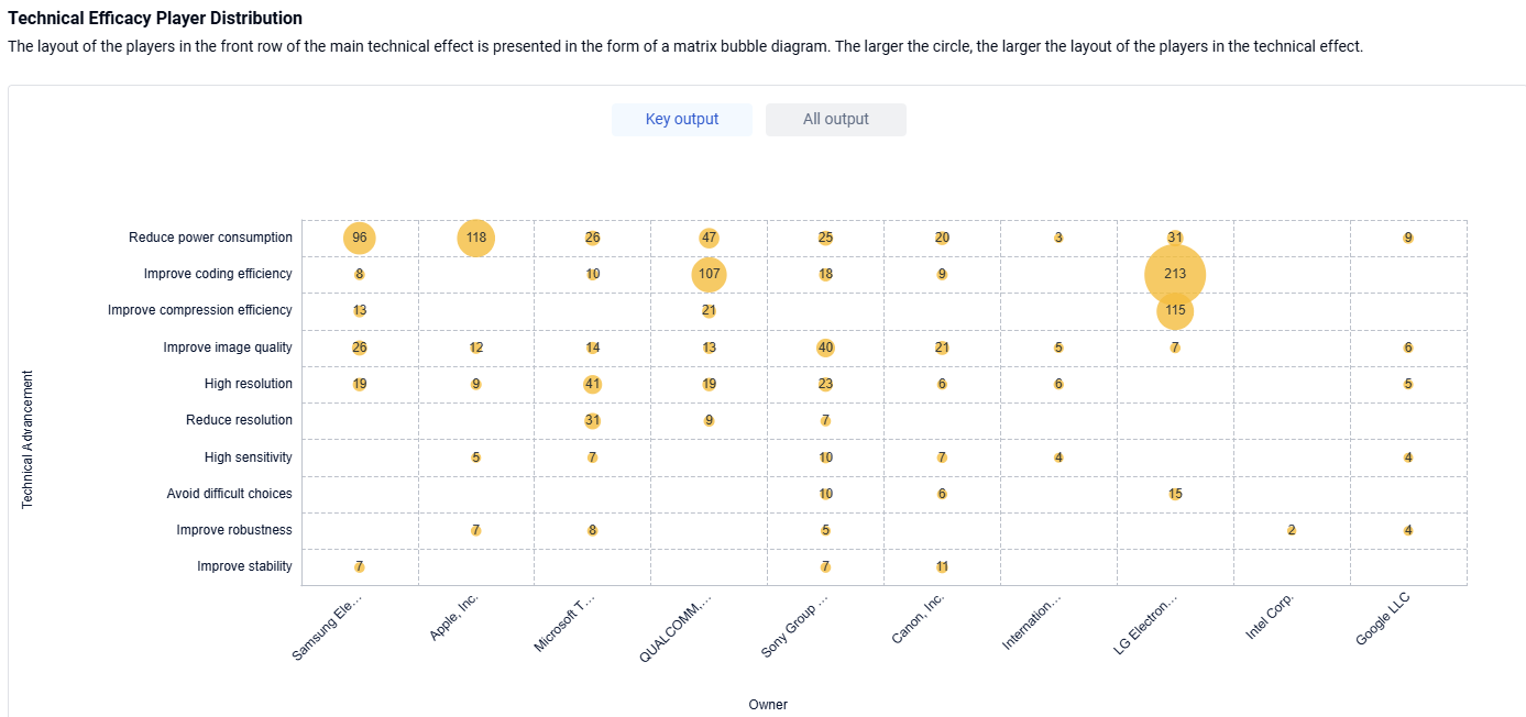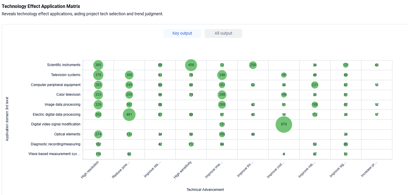 This matrix bubble chart provides an illustration of technology effect applications, aiding project tech and trend judgement.