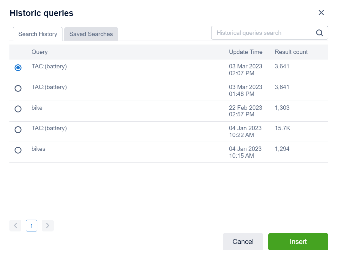 - Users can insert previous queries and saved queries into the search box by clicking "Historic queries" in the bottom left-hand corner